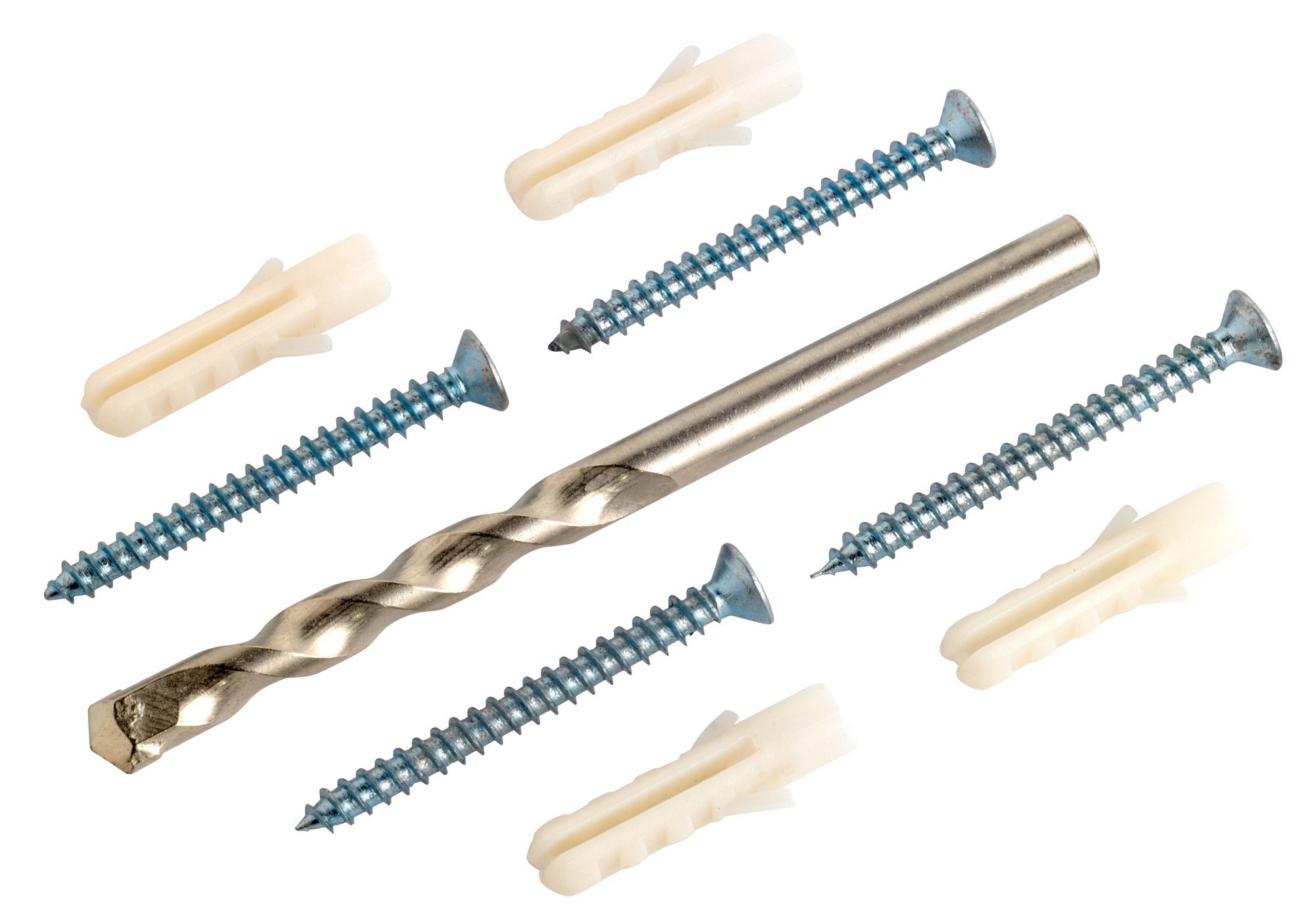 This unit comes supplied with all fixtures. We were advised in BQ just to use screws that were long enough to go through all 3 pieces of board the back. And using a pack of bq heavy weight fixing plugs and screws.