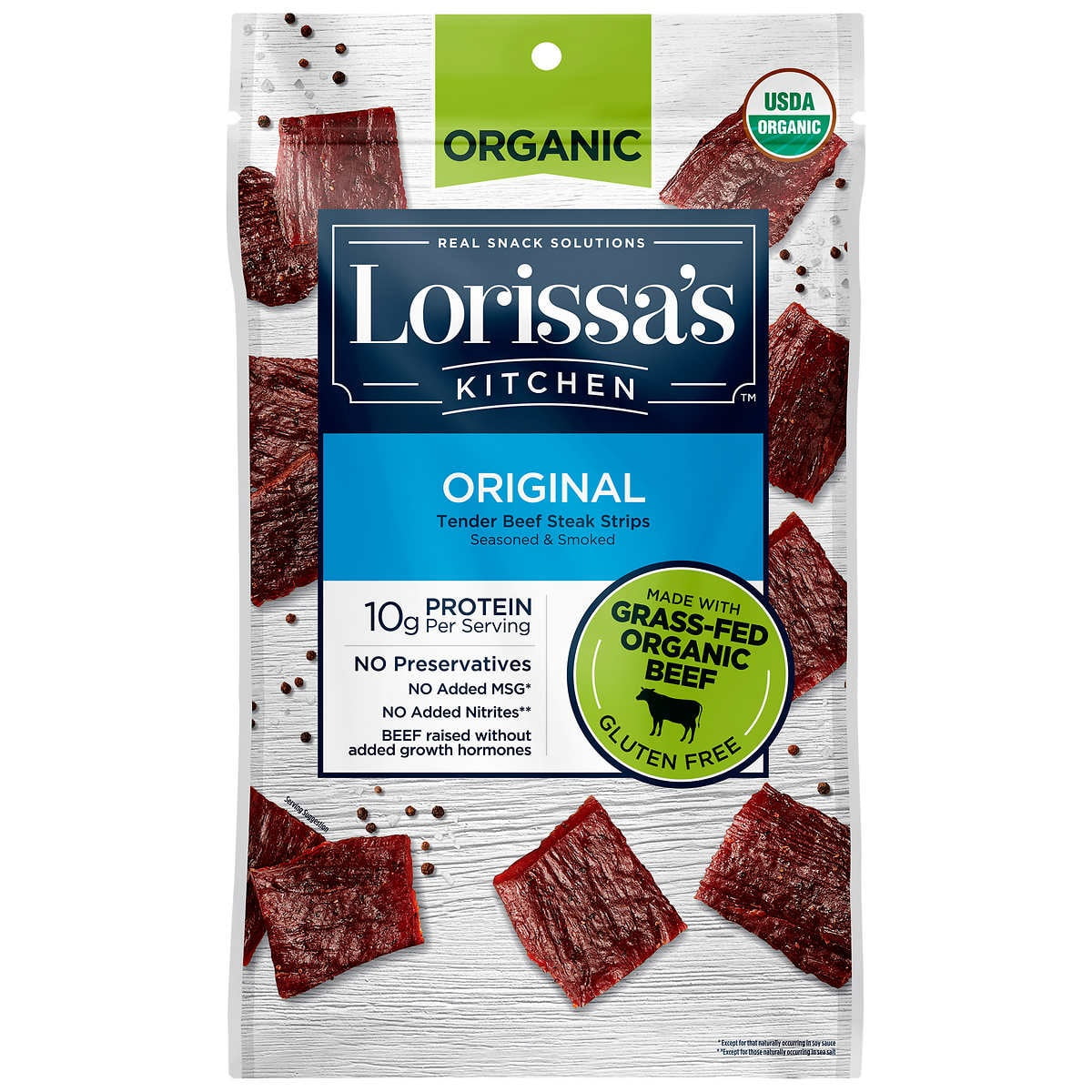 Lorissas Kitchen Organic Steak Cuts12 oz. When you need a quick and satisfying snack you need Lorissas Kitchen Original Premium Tender Beef Steak Strips. Organic Original Beef Steak Strips When you need a quick and satisfying snack reach for a bag of Lorissas Kitchen Certified Organic Original Beef Steak Strips.