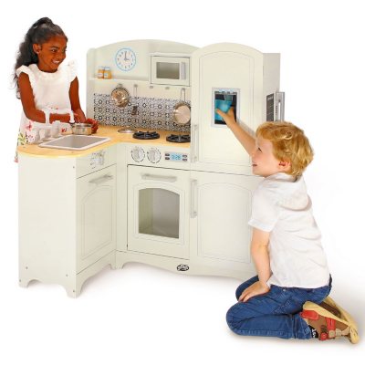 Play Wooden Kitchen zum kleinen Preis. High quality wooden kitchen with classic Shaker design Incredible value for money with huge size and L-shape layout Includes 5 stainless steel accessories 2 light and sound burners sound tap light-up microwave Includes fridge-freezer with dispensing ice maker and play ice phone and sink with plate. With a generous size and elegant design this stylish kitchen offers incredible value complete with five realistic stainless steel accessories.